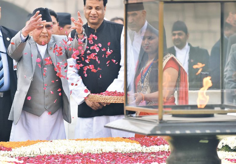 PM Oli laid a wreath at the Mahatma Gandhi mausoleum and also signed a visitors’ book kept there.