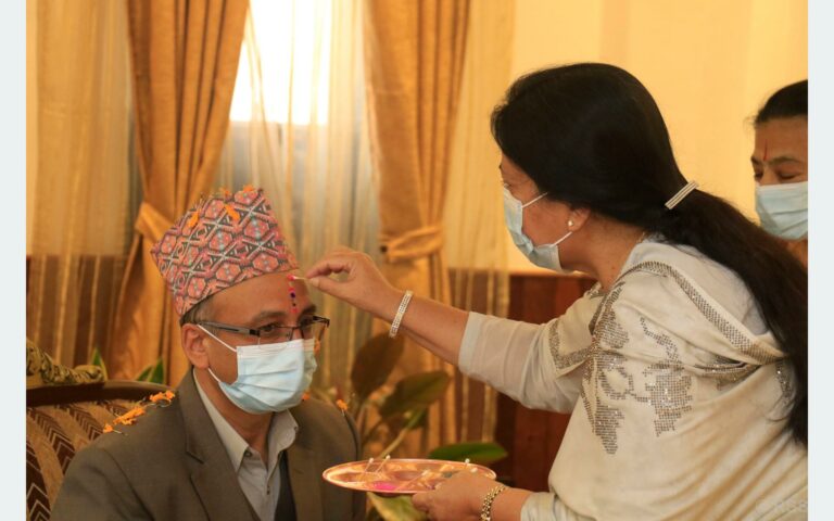 Similarly, President Bhandari on the occasion offered tika and garlands of dubo grass, Makhamali and Godabari flowers to her sister Sushila Pandey.