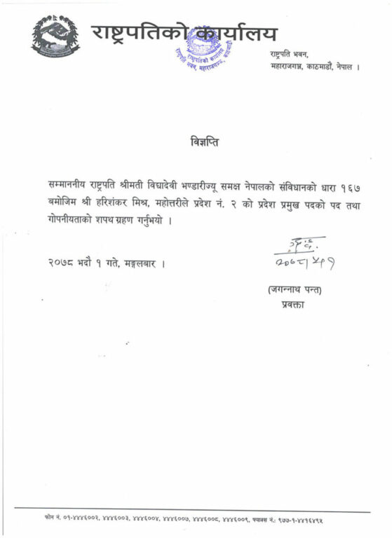 Province 2 Chief Hari Shankar Mishra sworn in to office