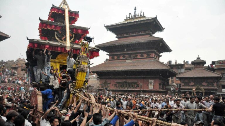 The festival begins with the pulling of the chariot of Bhaila Kha: (Bhairavnath) from the Panchtalle (five-storey) temple in Taumadhi this evening.