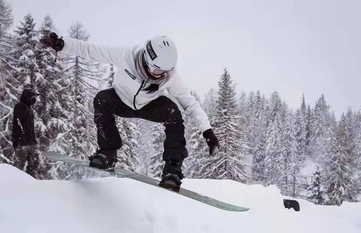 Photo shows Yongqing Lhamo taking part in snowboarding training.