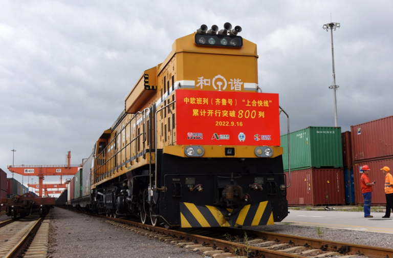 A China-Europe freight train loaded with various kinds of goods departs from the multimodal transport center in the China-Shanghai Cooperation Organization (SCO) Local Economic and Trade Cooperation Demonstration Area (SCODA) in Qingdao, east China’s Shandong province, Sept. 16, 2022. It marks the cumulative number of “Qilu” China-Europe freight trains from the SCO zone exceeding 800 since it was launched in April 2020. (Photo by Wang Zhaomai/People’s Daily Online)