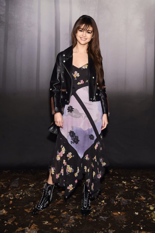 The “Wolves” singer and Coach brand ambassador showed up to the show with long brunette locks with bangs. She completed her transformation with a black leather jacket, a black and purple floral dress and lace-up black boots.