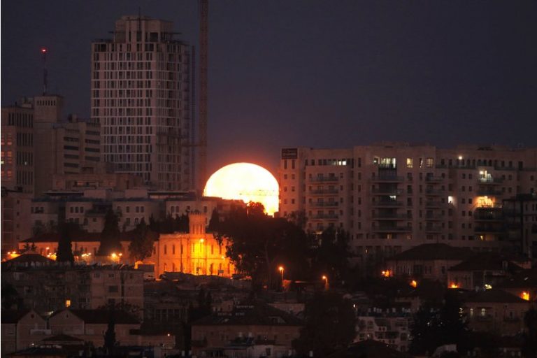 The moon sets behind the city of Jerusalem early on Jan. 31, 2018.