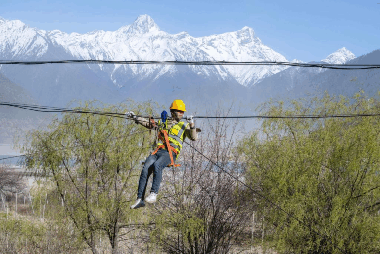 Photo shows a telecom worker performing his duty in Sangba village, Nyingchi city, southwest China’s Xizang autonomous region, March 27, 2025. (Photo/Lu Qihui)