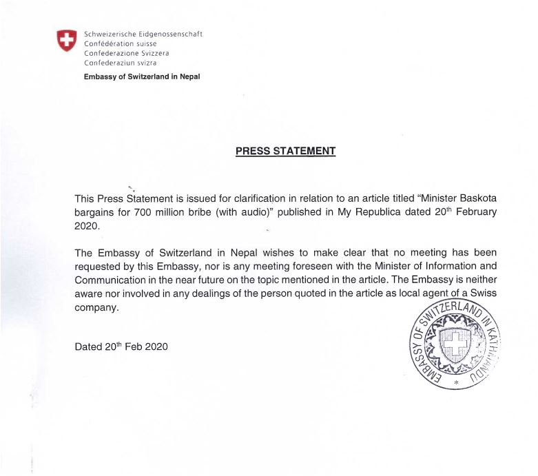 The Embassy of Switzerland in Kathmandu has clarified in relation to an article titles “Minister Baskota bargains for 700 million bribe with audio” published in My Republica dated 20 February, 2020.
