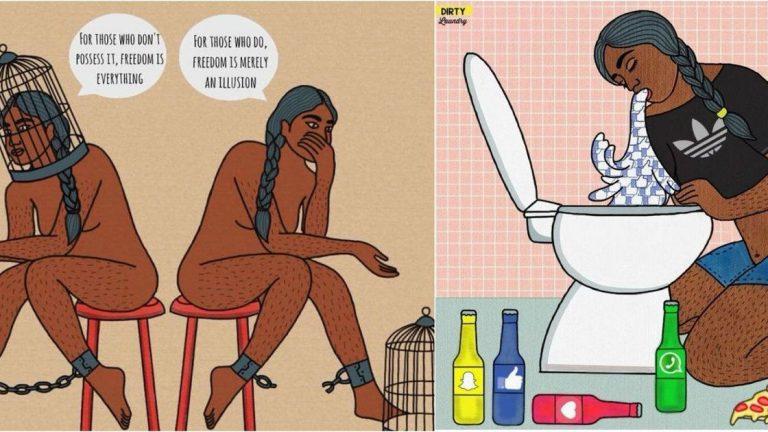 Most of her illustrations feature brown-skinned women with unshaven legs and arms – a deliberate choice to highlight insecurities around body image peddled by the beauty industry and even social media.