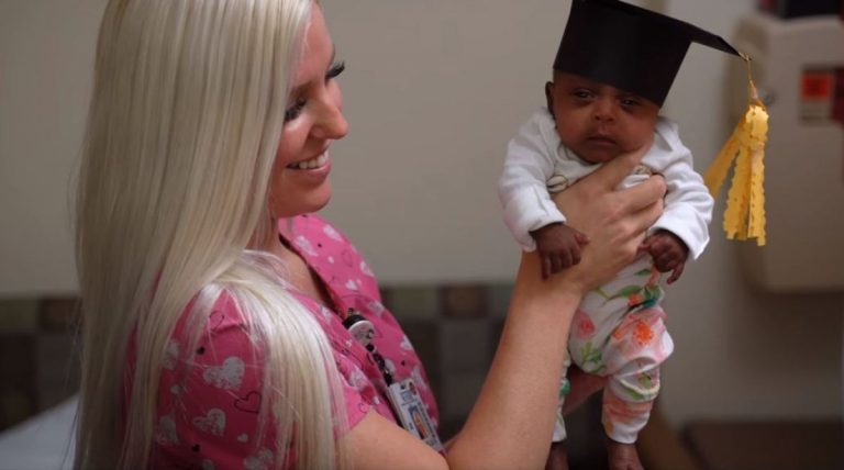 After nearly five months at the hospital’s neonatal intensive care unit, Saybie was discharged home earlier this month weighing a healthy five pounds (2.2 kilograms) and sporting a graduation cap.
