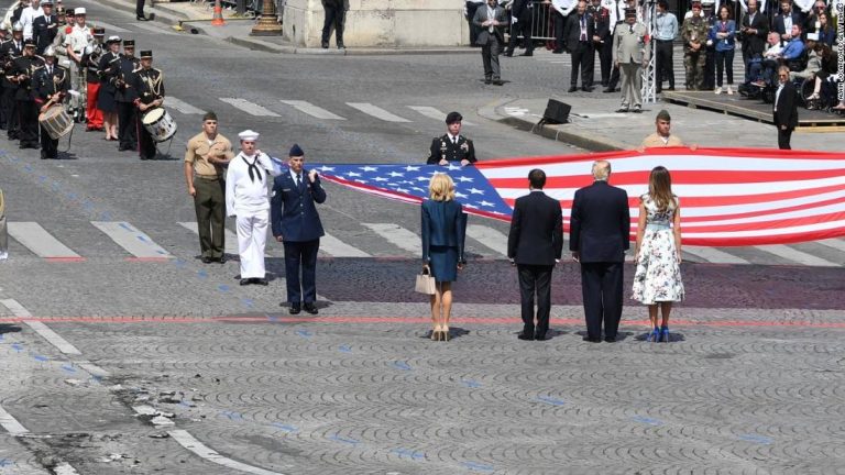 The occasion, marking 100 years since America entered World War One, saw troops march down the Champs-Élysées, accompanied by dozens of military vehicles, flyovers of military aircraft, and traditionally mounted cavalry.