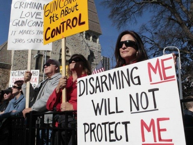 About 30 gun-rights supporters staged a counter-demonstration in front of FBI headquarters, standing quietly with signs such as “Armed Victims Live Longer” and “Stop Violating Civil Rights.” Other gun-control protests around the country were also met with small counter-demonstrations.